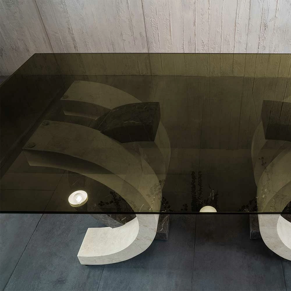 - Tischplatte aus bronzefarbigem Verbundglas mit einer Stärke von 1,4 cm