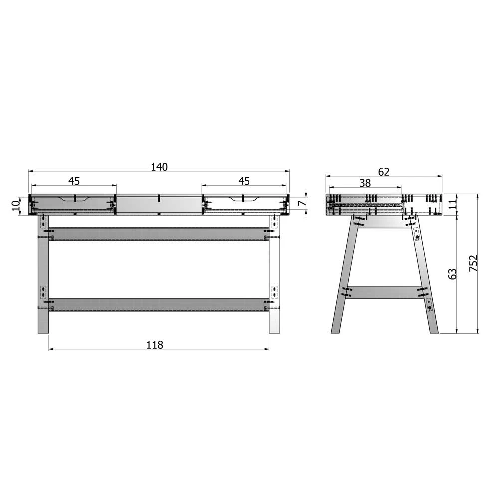 - Zwei Schubladen mit Metallauszug und Grifflöchern